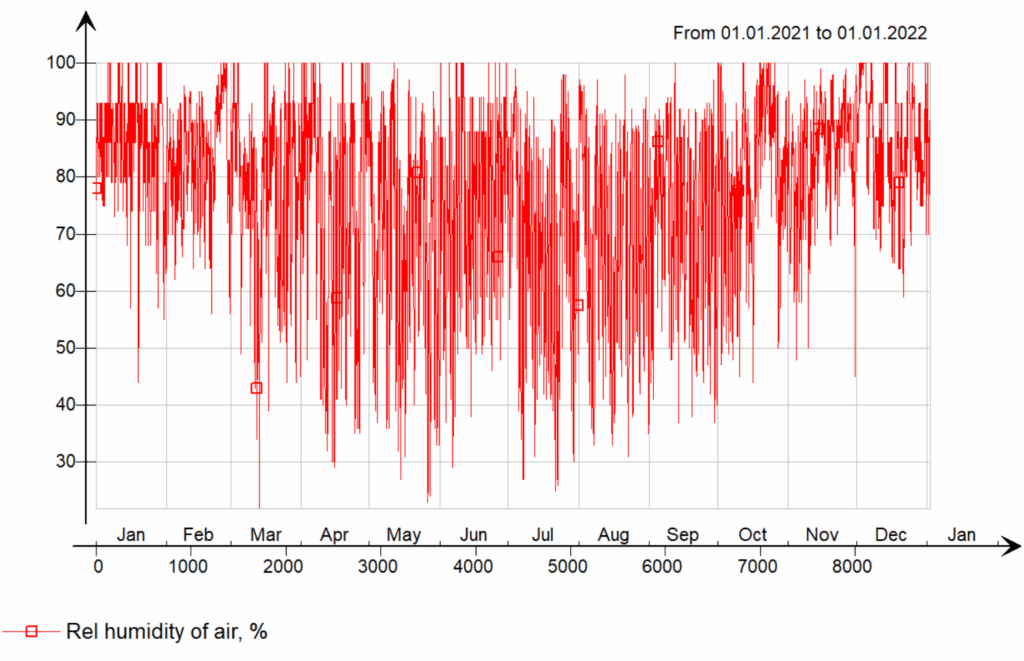 Auch im Sommer werden zeitweise relativ hohe relative Luftfeuchten erreicht.
