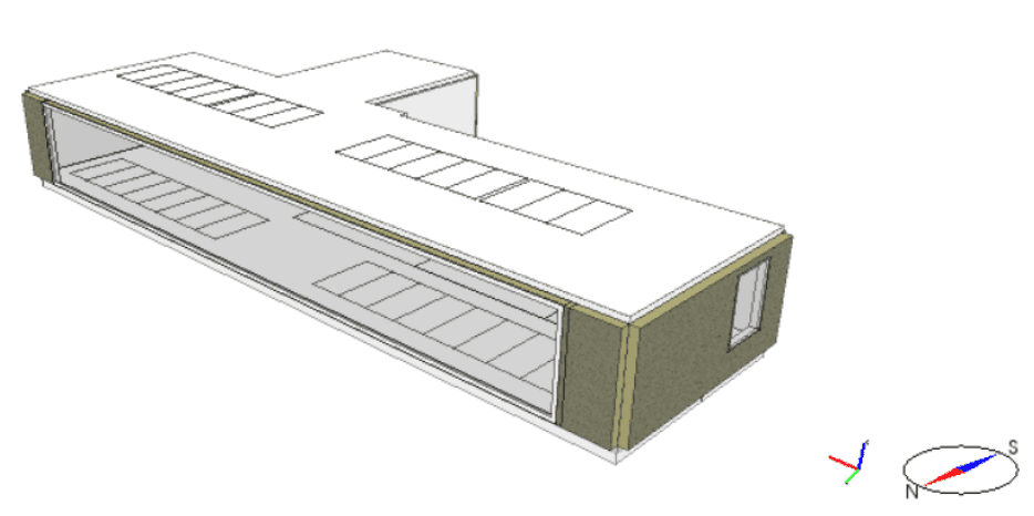 Auf Basis der ermittelten Daten wurden Simulationen angelegt. Die Software bildet dabei den ganzen Jahresverlauf mit realen Klimadaten ab. In der Abbildung ist die Straßenseite mit der Glasfassade zu sehen. Die Fensterfront wurde als ein Bauteil zusammengefasst. Also etwas „wärmedurchlässiger“ gerechnet als real vorhanden. Vorteil ist, dass sich die Simulation so wesentlich schneller rechnen lässt und einen zusätzlichen Sicherheitspuffer gibt.