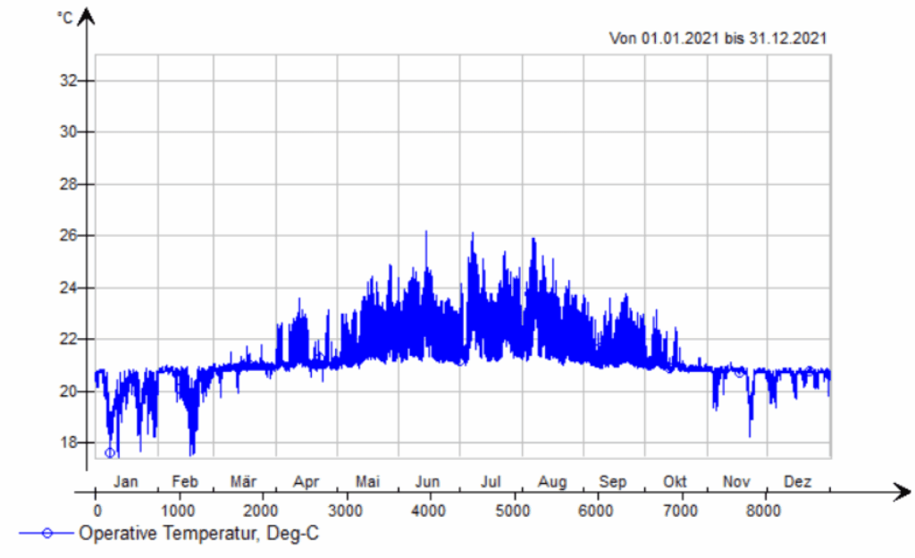 Ergebnis mit Kühlfunktion – Während maßgeblicher Zeiten über den Jahresverlauf werden mit Kühlung die Temperaturen unter 26 °C mit Deckenkühlung gehalten. Die stille Kühlung per Kühldecke im Sommer hält die Temperaturgrenze von 26 °C trotz Fensterlüftung ein.