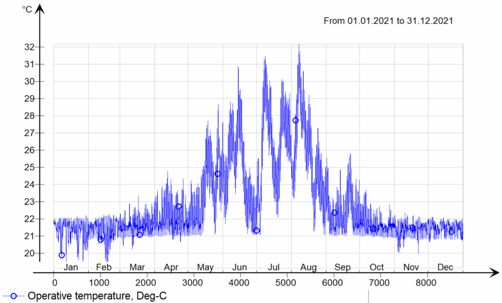 EErgebnis ohne Kühlfunktion – Im folgenden Bild sind die simulierten Raumtemperaturen unter Berücksichtigung der thermischen Masse, der Wärmelasten, des Lüftungsverhaltens und weiterer Faktoren abgebildet. Während maßgeblicher Zeiten über den Jahresverlauf ist ohne Kühlen mit Wärme über 26 °C, aber auch mit Hitze über 30 °C zu rechnen.