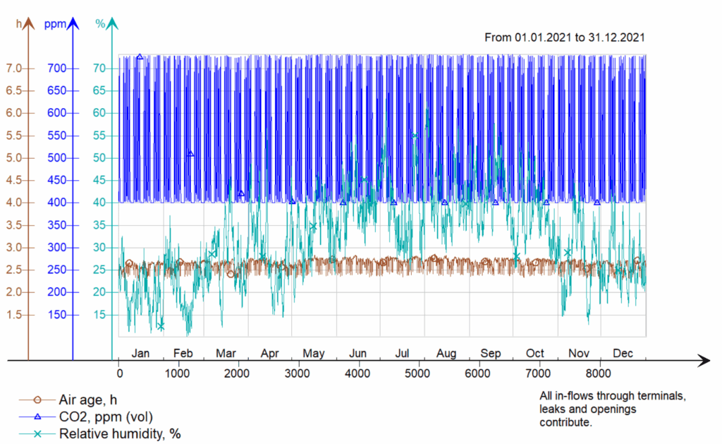 Der CO2-Gehalt der Raumluft schwankt zwischen 750 und 400 ppm. Ab 750 ppm wird bis 400ppm über die Fenster frische Luft eingebracht. Im Sommer kann die relative Luftfeuchte partiell bis auf ca. 55-60 % steigen.